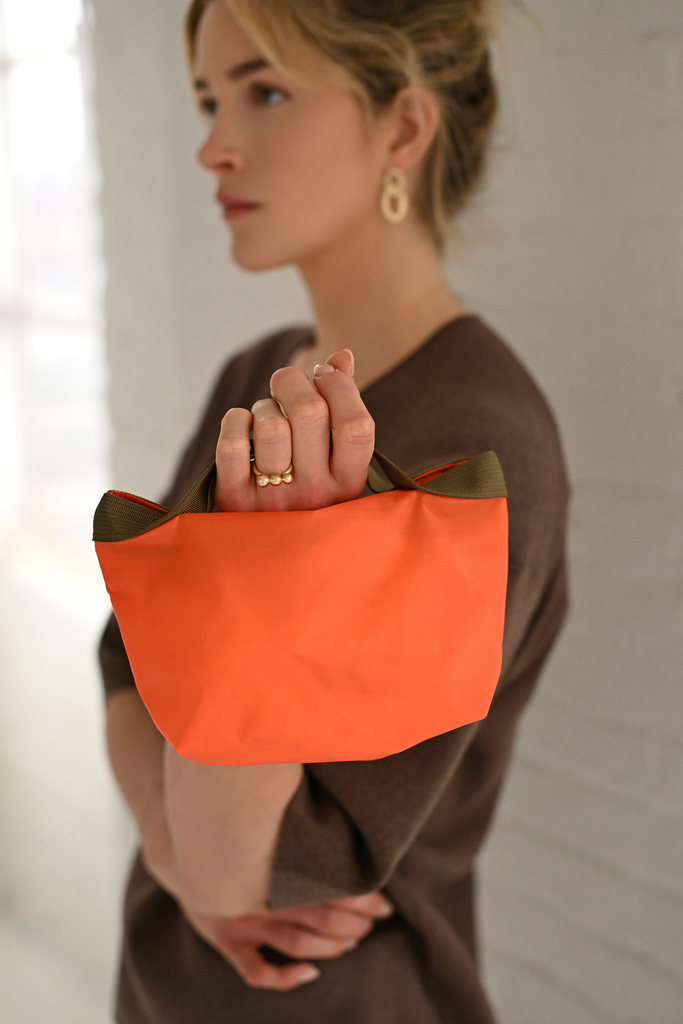 Nylon webbing handles, zipper closure, two inner pockets, unlined interior